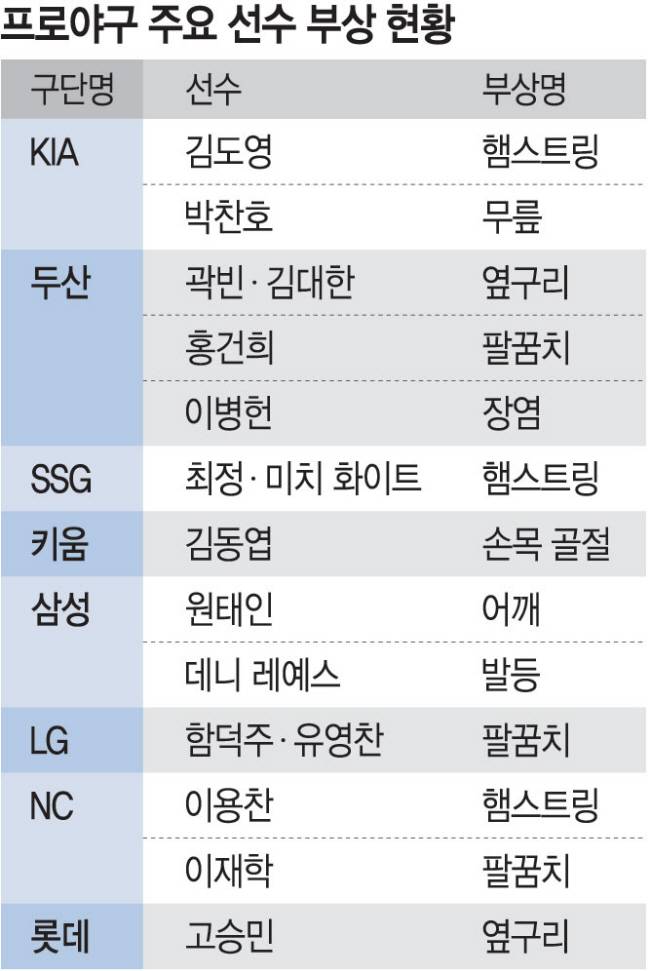 허벅지·무릎·팔꿈치… ‘야구 부상’ 구단 비상