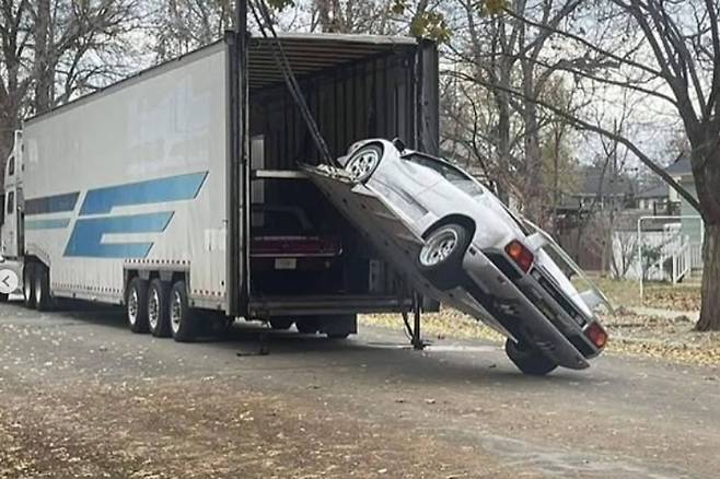 트럭은 클래식 포드 머스탱을 적재하기 위해 디아블로를 먼저 하역하는 과정에서 사고를 겪었다.