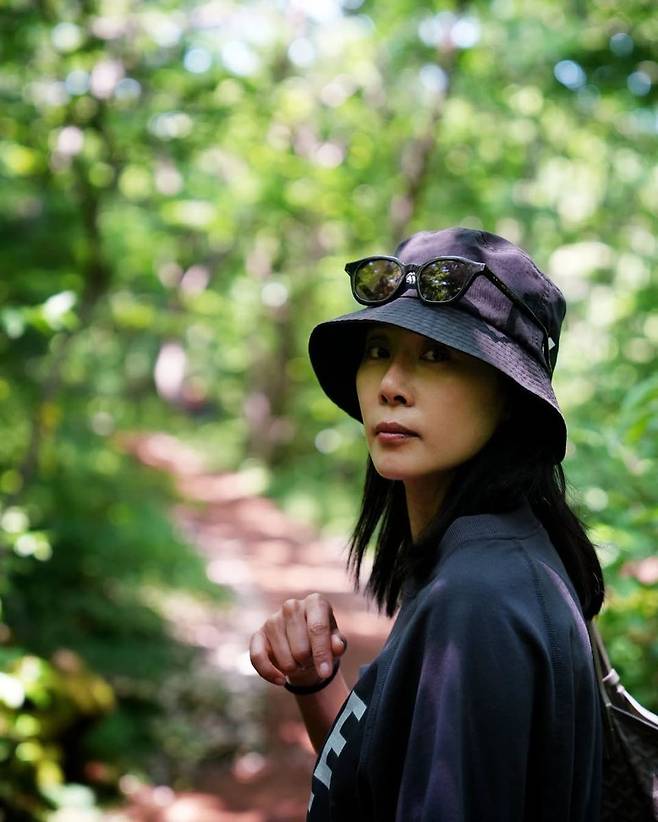 특히 눈길을 끄는 건 블랙 컬러의 버킷햇이다. 햇빛을 살짝 가리면서도 스타일리시함을 놓치지 않는 아이템으로, 문정희의 꾸안꾸 룩에 완벽한 마무리를 더한다. 숲속이라는 장소와 조화를 이루는 듯한 이 버킷햇은 아웃도어 감성까지 챙긴 센스 있는 선택이다. 전체적으로 과한 포인트 없이 자연 그대로의 분위기를 살린 이번 스타일은, 편안한 산책길이나 여행지에서도 활용도 높은 데일리룩이다.