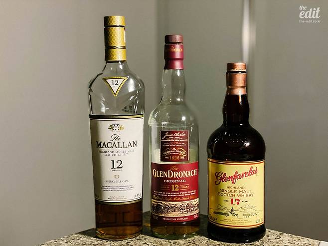 [이른바 셰리 삼대장, 왼쪽부터 맥캘란 12년, 글렌드로낙 12년, 글렌파클라스 17년 (12년이 없어 대체)]