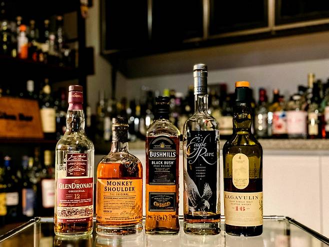 이런 고민 끝에 고른 다섯 가지 위스키를 소개한다. 싱글몰트, 블렌디드 몰트, 블렌디드, 버번, 그리고 피티드 싱글몰트까지 종류별로 하나씩 골랐다. 모두 실제로 애정하는 위스키들이다. 아래 사진은 모두 직접 마시던 병을 촬영한 것이다 보니 남아있는 위스키 양이 제각각인 점 양해 바란다.