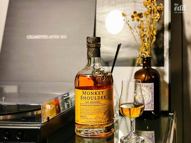 몽키 숄더는 블렌디드 몰트위스키다. 싹을 틔운 보리를 뜻하는 몰트 이외의 다른 곡물이 들어가지는 않지만 여러 증류소에서 몰트를 이용해 만든 원액을 섞어서 만든다. 몽키 숄더는 발베니, 글렌피딕 등 유명 싱글몰트 위스키 증류소를 다수 소유한 글로벌 주류 회사 윌리엄그랜트앤선즈에서 만드는 위스키로, 이 회사가 소유한 여러 증류소에서 만든 원액을 블렌딩 해 만든다. 블렌딩을 하는 이유는 풍미를 부드럽게 하기 위함이다. 증류소마다 원재료, 환경, 가공방식 등이 모두 다르므로 저마다의 개성을 갖기 마련인데, 블렌딩을 통해 툭툭 튈 수 있는 개성을 줄이고 둥글고 부드러운 풍미를 만들어 낸다. 싱글몰트 위스키가 호불호가 명확히 나뉠 수 있다면, 블렌딩은 불호를 줄이는 과정인 셈이다.