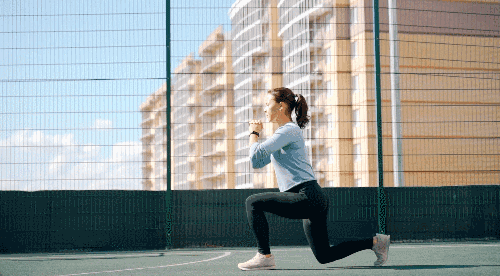 바닥에 서서 손을 가슴 앞에서 깍지 끼고 잡은 뒤, 오른발을 앞으로 크게 내딛습니다. 앞 무릎은 90도로 구부리고, 뒤 무릎은 바닥에 닿기 직전까지 낮춥니다. 이후 왼발을 앞으로 가져와 같은 동작을 반복합니다.