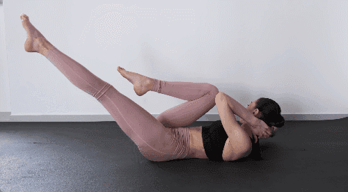 매트에 누워 손을 머리 옆에 두고 다리를 공중에 들어 올립니다. 오른쪽 무릎을 가슴 쪽으로 당기며 상체를 비틀어 왼쪽 팔꿈치가 오른쪽 무릎과 가까워지도록 합니다. 반대쪽도 동일하게 교차하여 반복합니다.