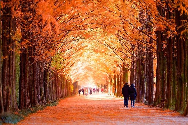 산책길에는 단풍으로 물든 메타세쿼이아와 연못이 엽서처럼 추억을 상기시킵니다.