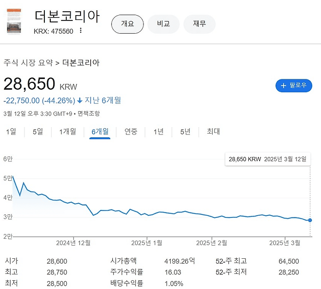 백종원의 논란이 불거지면서 더본코리아는 주가 하락을 면치 못했는데, 한국거래소에 따르면 3월 14일 기준 더본코리아 주가는 2만 8,650원으로, 상장 이후 최고가 대비 56.2%가량 하락한 것으로 나타났습니다.