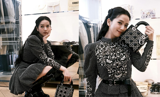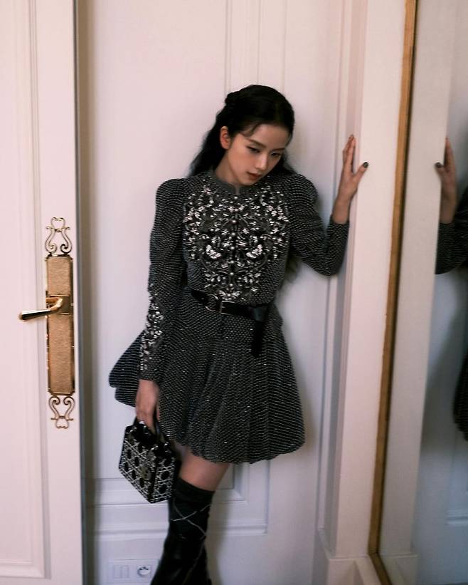 사진 속 지수는 화려한 블랙 도트 원피스를 입고 블랙 롱부츠를 신어 러블리하면서 시크한 코디를 선보였다.