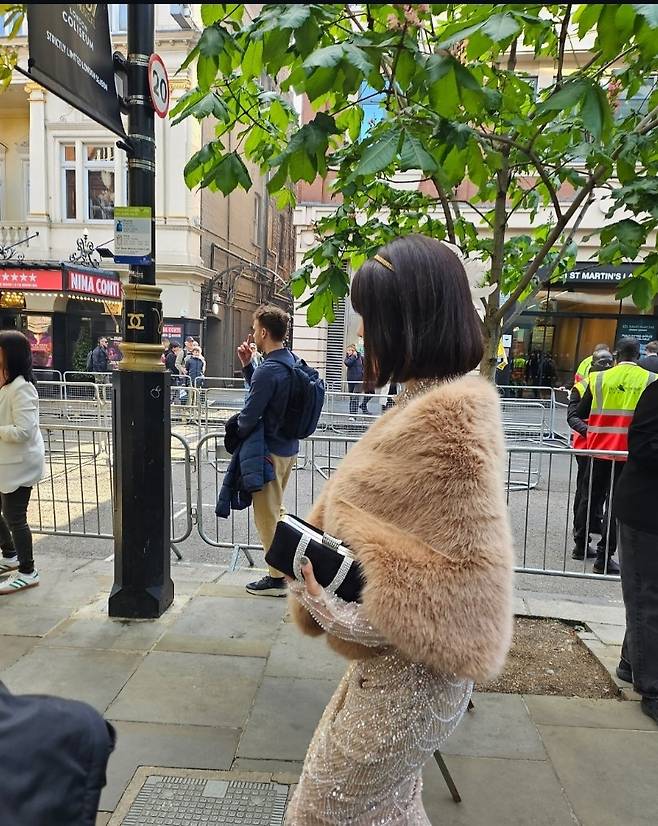 특히 하늘하늘한 비즈 드레스뿐 아니라, 팔목까지 감싸는 시스루 장갑과 금빛 페이크 퍼 숄까지 더한 글램룩으로 시선을 사로잡았습니다.