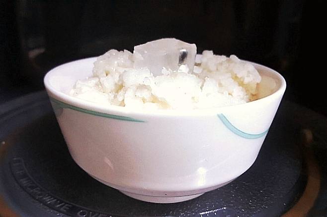 그다음 전자레인지 넣고 평소처럼 해동해 주시면 되는데요. 얼음이 천천히 녹으면서 수분을 공급해 주어 밥이 마르지 않게 해 줍니다.