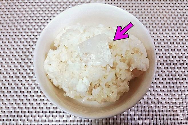 하지만 냉동밥에 얼음을 활용하면 갓 지은 듯 맛있게 해동할 수 있답니다. 일단 냉동밥에 얼음 한 개를 올려줍니다. 냉동밥이 많다면 얼음 2개 올려줍니다.