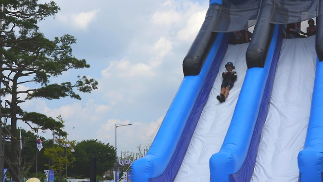 서울썸머비치 행사에서 사람들이 가장 몰렸던 곳은 역시 8m 길이 ‘물 미끄럼틀’이었다. 물 미끄럼틀은 총 2대다. 미끄럼틀 낙하지점에는 공기가 빵빵하게 들어간 에어 풀장을 놓아 사고를 방지했다. 미끄럼틀 위로 차광막이 드리워져 뜨거운 한낮에도 시원하게 물놀이를 즐길 수 있다. 다만 안전상의 이유로 신장 110㎝ 이하는 물 미끄럼틀 이용을 제한한다.