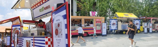 썸머마켓은 다양한 먹거리가 가득한 ‘서울 먹거리 존’과 물놀이용품을 살 수 있는 ‘체험 마켓’으로 나뉜다. 썸머마켓 서울 먹거리 존은 현대백화점에 입점한 가게로 이루어진 단기 운영 상점으로 구성했다. 먹거리 존에서는 초당 옥수수, 떡볶이, 치킨, 커피 등 물놀이 후 허기를 달랠 수 있는 다채로운 음식을 판매한다.단기 운영 상점에는 악어떡볶이, 신포닭강정, 엔티엔스 프레즐, 배스킨라빈스 등이 있다. 먹거리 존에서 음식을 구매하려면 ‘주문 접수대’에서 먼저 주문한 뒤 가게로 음식을 찾으러 가야 한다.