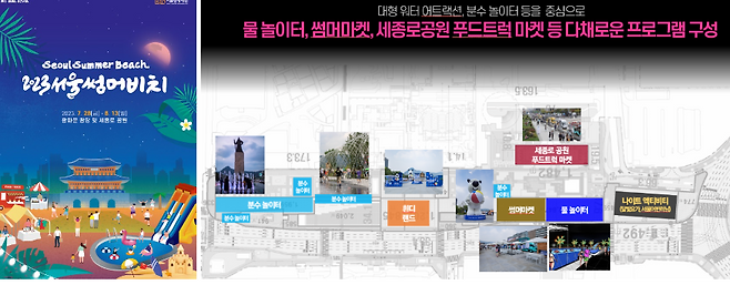 서울썸머비치는 ‘ 도심 속에서 느끼는 여름 바다’가 콘셉트다. 서울썸머비치 행사 장소는 광화문광장부터 세종로공원까지다.광화문광장 곳곳에 물놀이 시설과 그늘 정자 등을 설치해 시민들이 더위를 피할 수 있는 공간을 만들었다.