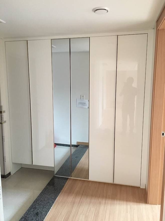 안방 안쪽의 조그마한 공간에 기본 옵션인 시스템장이 설치되어 있었지만 먼지와 정리가 걱정되었고 유행이 지난 우드톤이 마음에 들지 않아 모두 철거하기로 하였습니다.