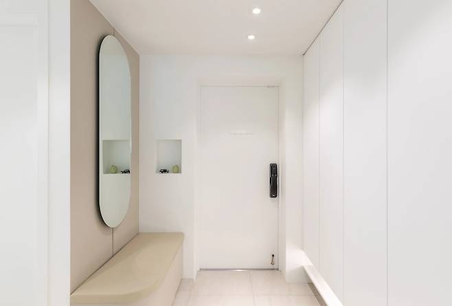 집에 사용된 모든 마감재는 동일한 제품과 색상으로 최대한 통일성을 유지했습니다. 현관은 화사한 아이보리 컬러의 600각 타일로 밝은 느낌을 주었고 빈 공간에 수납이 가능한 베이지 톤의 벤치와 라운드형 거울을 배치했습니다.