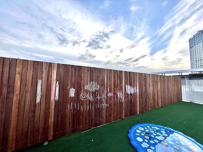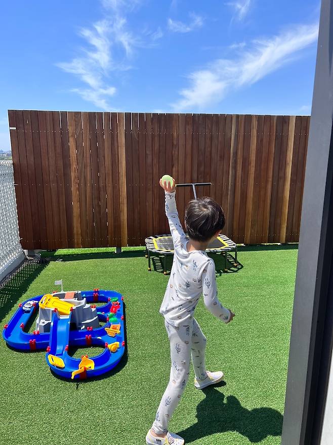 코너에 위치한 넓은 공간에는 주로 아이가 노는 공간입니다. 가벼운 물놀이나 트램펄린, 모래놀이 등을 하며 놀고 있고 올여름에는 옥상 워터파크를 개장해 루프탑 수영장을 누렸습니다.
