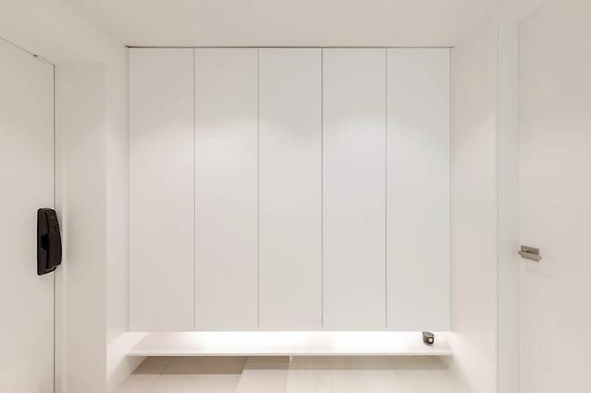 공간이 좁아 중문은 설치하지 않았고 기존의 신발장은 철거, 신발장 하단의 공간을 두어 자주 신는 신발을 넣을 수 있는 공간을 만들었습니다.
