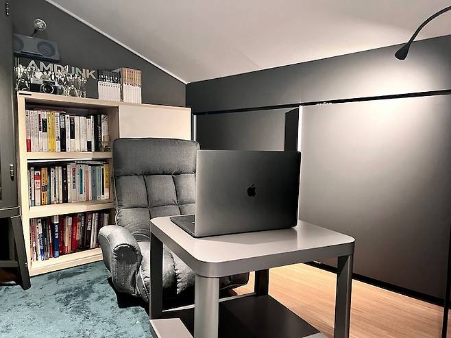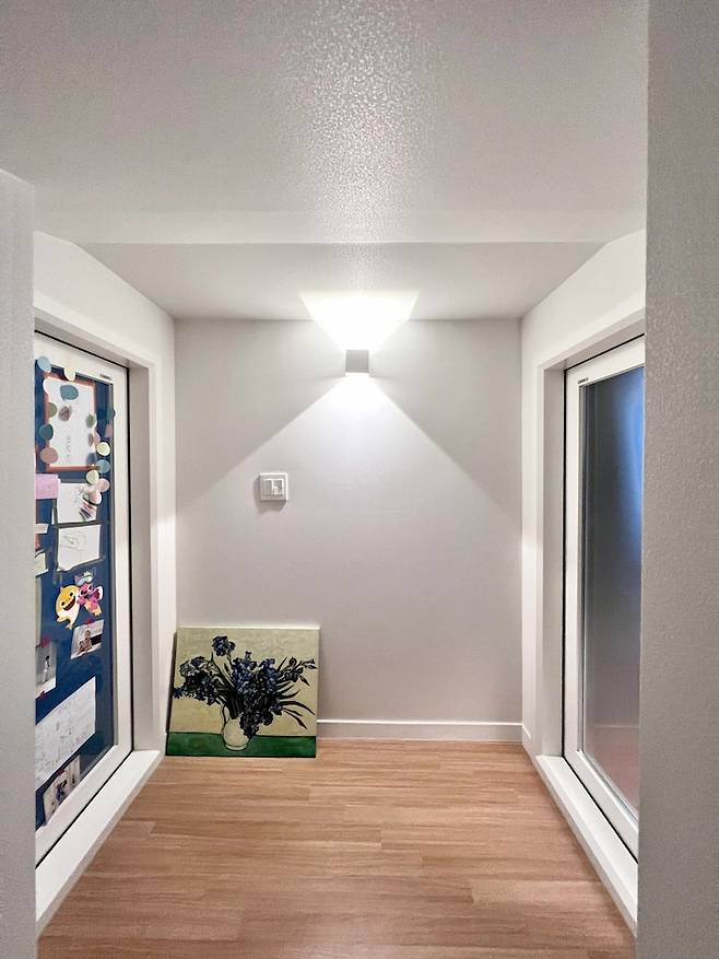가끔 악기 연주를 하거나 노래를 부르고 싶어 방음벽과 소음에 강한 터닝 도어를 설치한 공간입니다. 혹시나 이웃에 소음이 들리면 어쩌나 걱정했는데 테라스에서 확인해 보고 아래층에서 들어봐도 노랫소리가 전혀 들리지 않아 안심하고 있습니다. 예상보다 많은 금액이 들었지만 아이가 매우 즐거워해 노래방 설치하기를 잘했구나 하고 있어요.