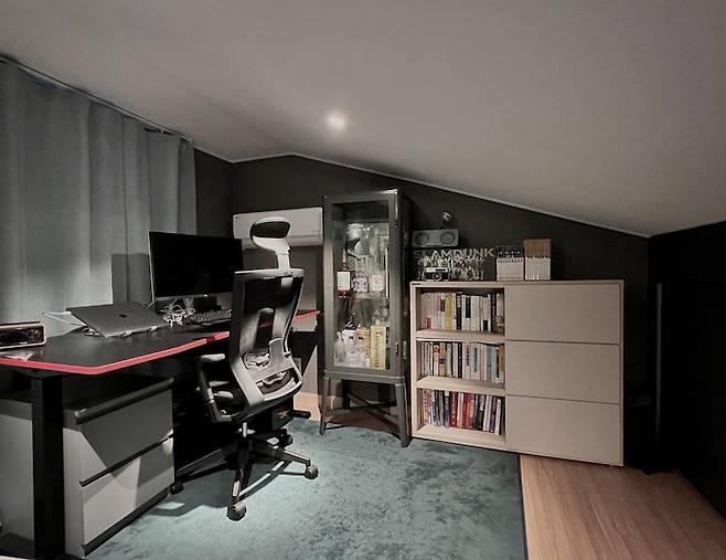 저희 집에서 가장 다크한 공간입니다. 어두운 벽지와 동일한 컬러의 슬라이드장, 에메랄드그린의 러그로 남자만의 동굴 느낌을 살린 아빠의 놀이공간은 PC방, 독서실, 헬스장, 가족 노래방까지 작지만 가장 바쁜 공간입니다.