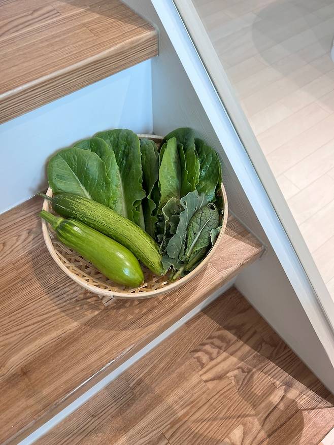 저희 집 테라스 텃밭에서 직접 키운 산지 직송 채소들입니다. 주말마다 고기를 구워야 하는 이유 중 하나이기도 하지요. 아파트에서 전원생활의 묘미를 조금이나마 느낄 수 있어 즐거운 나날들입니다.