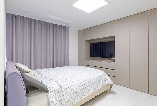 다시 1층으로 돌아와서 나머지 공간을 둘러볼까요? 이곳은 은은한 라벤더 색상의 커튼과 침구로 차분한 분위기의 안방입니다. 안방은 붙박이장이 없고 안방 화장실 옆에 작은 드레스룸만 있었던 구조였는데요, 그러다보니 옷을 수납할 공간이 부족해 한쪽 벽면에 TV 장 겸 붙박이장을 제작, 남편의 옷들을 모두 수납하고 있습니다. 주방의 상단 수납장과 동일한 마감재를 사용했습니다.