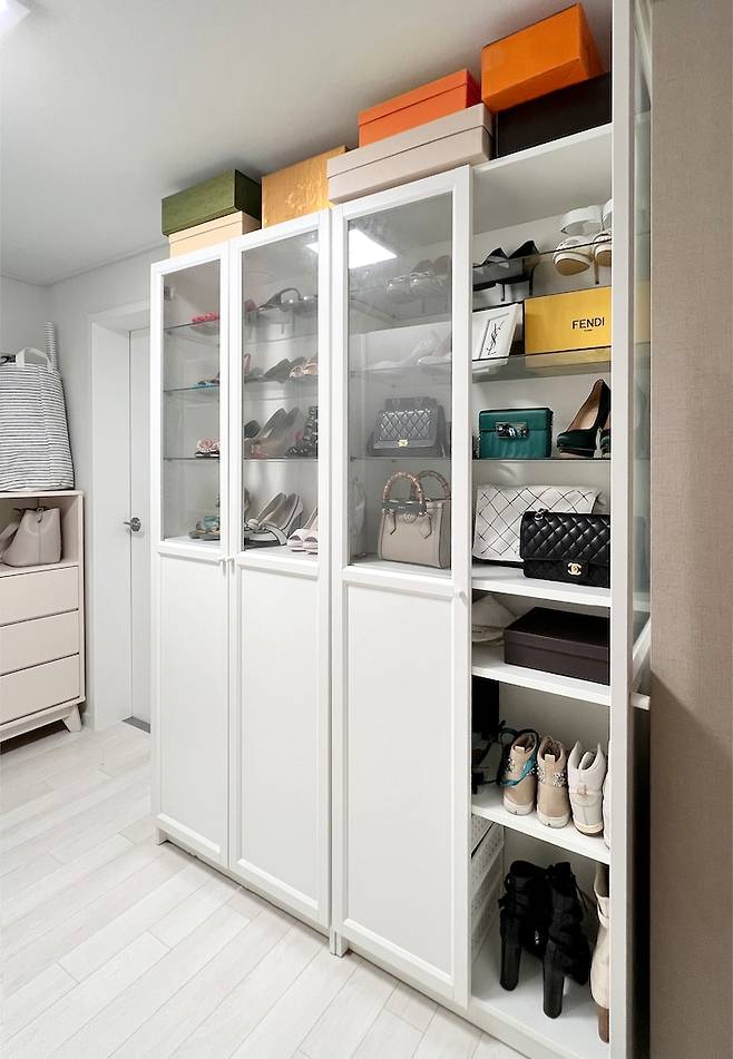 안방의 붙박이장에는 남편의 옷을 넣어두고 드레스룸에는 저의 옷과 가방, 아끼는 구두를 수납하고 있습니다.