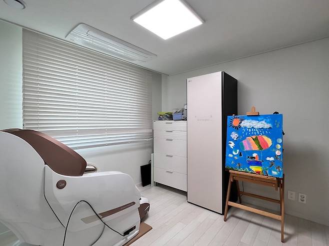 취미가 많은 저의 취미용품 보관용 서랍장과 스타일러, 그리고 이젤 등 서로 짝이 맞지 않는 제품들이 어설픈 동거를 하고 있는 공간이기도 하지만 아이와 제가 그림을 같이 그리는 공간이기도 합니다.