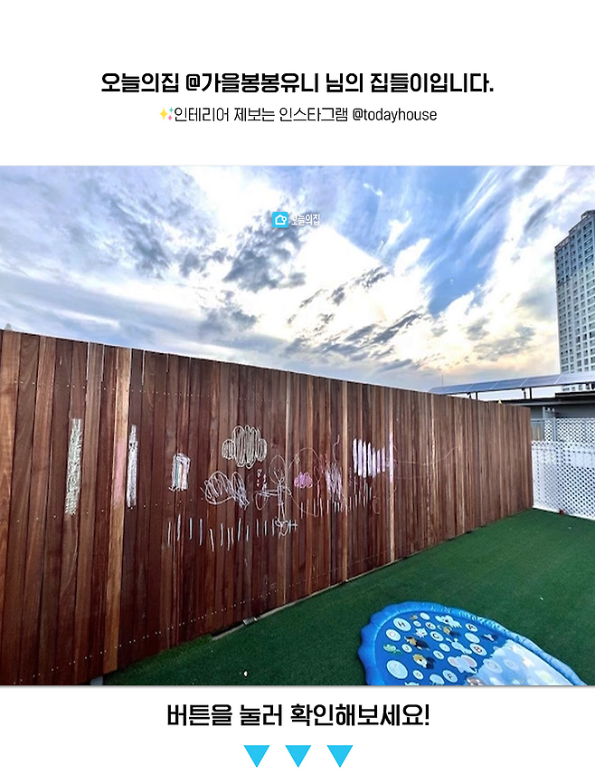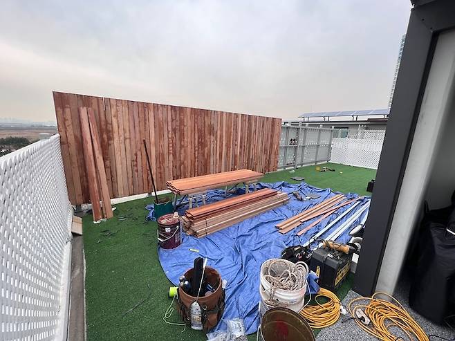 이웃집과 마주하는 양쪽 벽면에 방칼라이목으로 펜스를 설치하였고 20평 정도의 넓은 테라스는 두 공간으로 나누어 사용 중입니다.