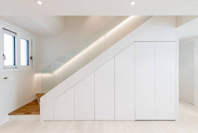 구조를 바꾸며 계단의 입구가 주방 쪽에 위치하게 되었고 유리 난간을 설치, 안전을 위한 손스침바와 간접조명도 시공하였습니다. 날렵하고 세련된 계단과 천장 구조의 변화가 아주 만족스럽습니다.