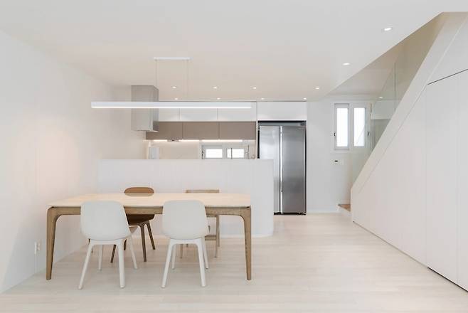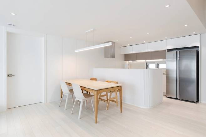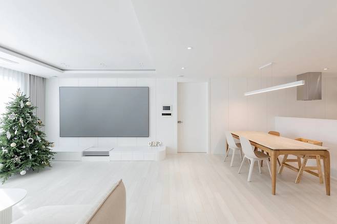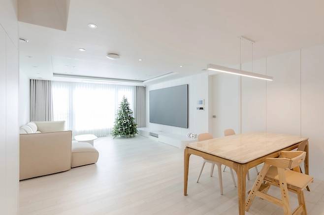 공사하는 동안은 남편보다 현장 실장님과 통화를 더 자주 하며 스트레스 받기도 하고 걱정도 많았지만 공사가 끝난 집을 보고 있으면 우리가 고민하고 상상하던 공간들이 고스란히 눈에 들어와 무척 행복합니다. 요즘도 아이를 등원시키고 소파에 앉아 가만히 천장만 바라보아도 간결한 선과 면의 만남에 행복해집니다.