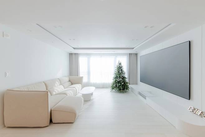 거실은 가구가 많지는 않지만 3미터의 커다란 소파, 120인치의 더 커다란 스크린이 자리하고 있어 최대한 색상을 줄이고 최소한의 가구만 두고 사용하고 있습니다. 저희 가족은 뭐든 큰 걸 참 좋아하는 것 같네요.