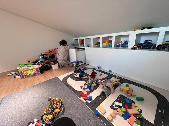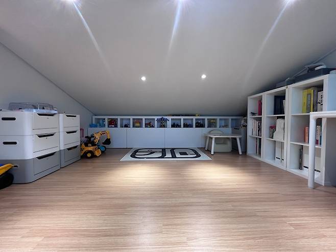 놀이방에 장난감을 모두 보관하고 있어 아래층의 화이트 인테리어가 유지되고 있습니다.