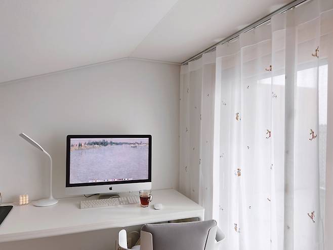 이따 소개할, 아래층 작은방의 안마의자에게 자리를 빼앗긴 저의 책상과 책장은 아이 놀이방 한쪽 벽면에 세 들어 살고 있습니다. 햇빛이 강해 은은한 커튼을 걸어 놓았습니다.