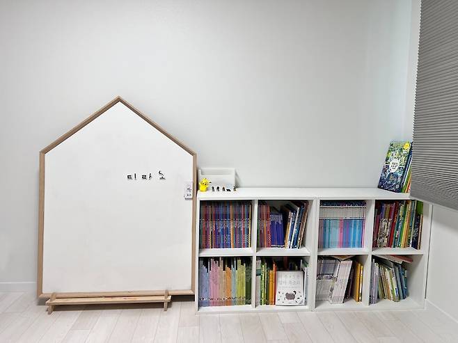 책은 구입하기보다는 전집 대여를 이용하고 있어 책장도 소박하네요. 선물 받은 자석보드는 처음에는 다락방에 두고 그림 그리는 용도로 사용하다가 아이가 한글을 익히기 시작하면서 아이 방으로 옮겨서 알차게 활용하고 있습니다.