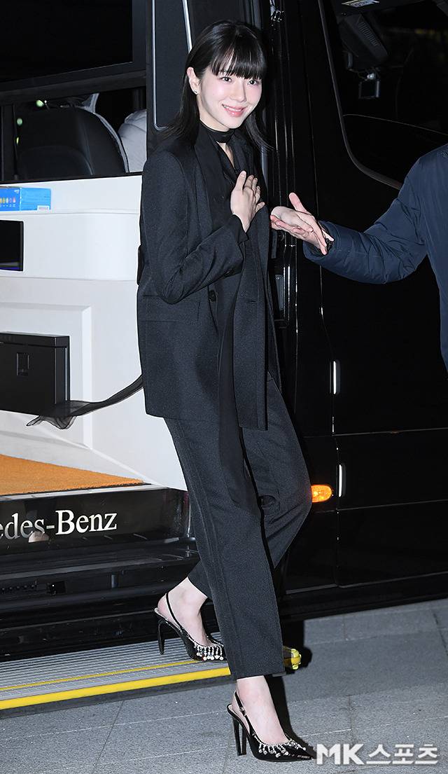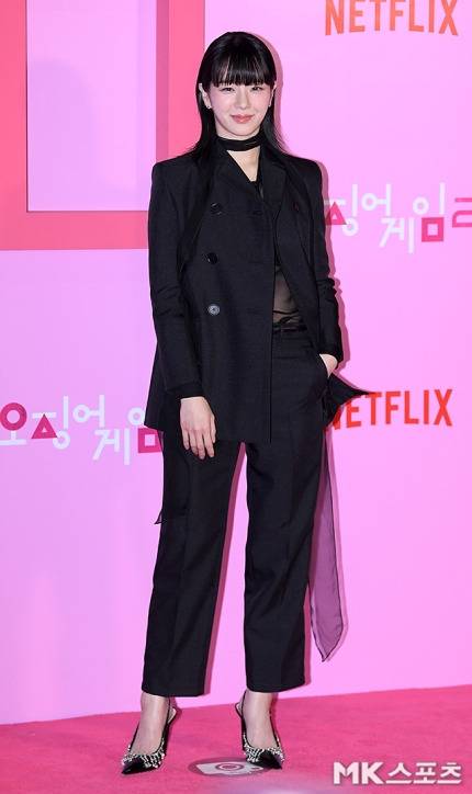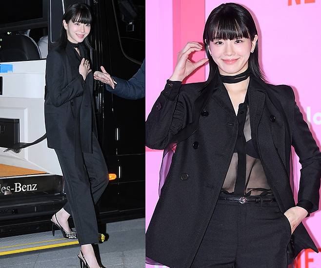 특히 재킷의 스트럭처드 실루엣과 팬츠의 슬림핏이 박규영의 날씬한 몸매를 더욱 돋보이게 했습니다.