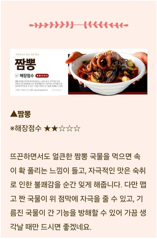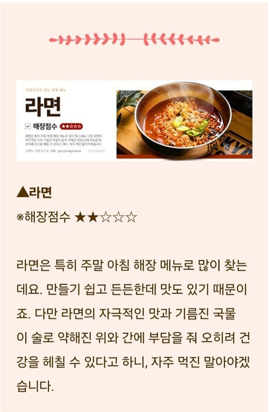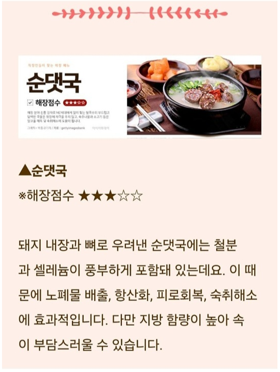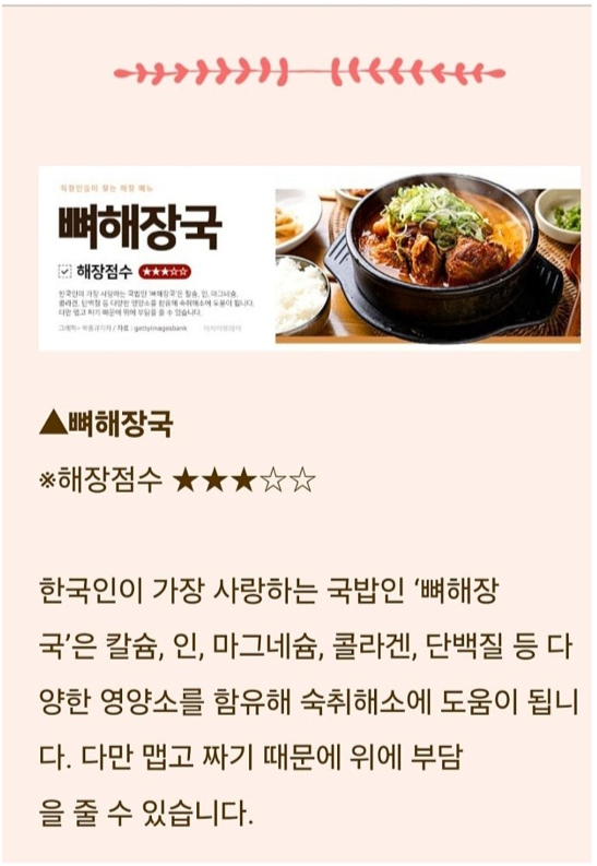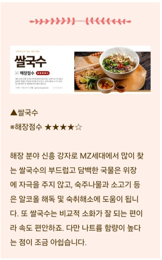 술로 인해 위가 민감해지므로 부드럽고 소화가 잘 되는 음식이 좋아요.