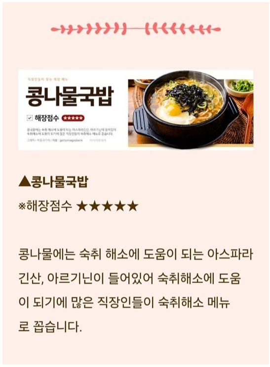 콩나물국: 아스파라긴산이 알코올 분해 촉진