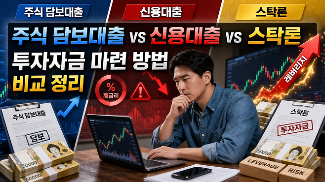이 글은 주식담보대출, 신용대출, 스탁론 등 투자자금 마련 방법에 관한 일반 정보를 제공하기 위한 참고용 내용입니다. 실제 대출 가능 여부, 금리, 한도, 담보유지비율, DSR 적용 여부, 반대매매 조건, 수수료는 금융기관과 상품, 개인의 신용도, 자산 상황에 따라 달라질 수 있습니다. 본문은 투자 권유나 재무, 법률, 세무 자문을 대신하지 않습니다. 주식투자와 레버리지 활용에 따른 손실은 본인 책임입니다. 최종 결정 전에는 해당 금융회사 약관과 상품설명서를 반드시 확인하시기 바랍니다. 필요하면 금융 전문가와 상담한 뒤 신중하게 판단하시기 바랍니다.