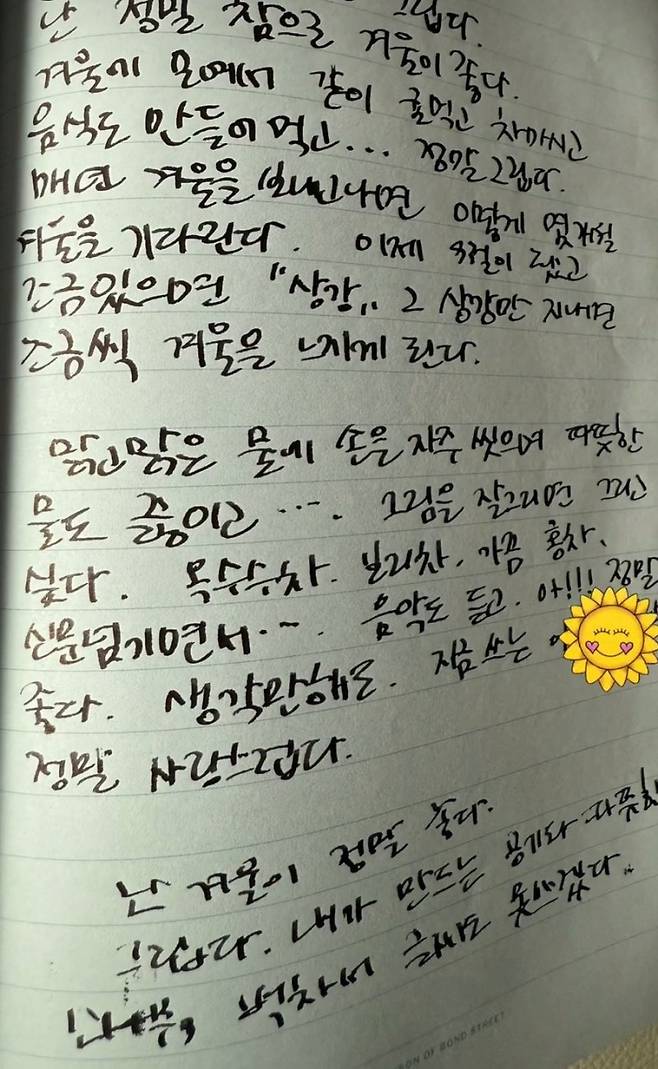 또, 겨울을 정말 좋아한다는 메모와 함께 “벅차서 글씨도 못 쓰겠다”라며 겨울에 대한 애정을 드러내기도 했답니다. ❄️ 다 타고 남은 초 받침 사진을 올리면서는 “많은 이야기들이 생각난다”라고 적어 과거 추억을 회상하는 모습도 보였어요. 🤔 뭔가 분위기 있고 감성적이더라구용. 🕯️