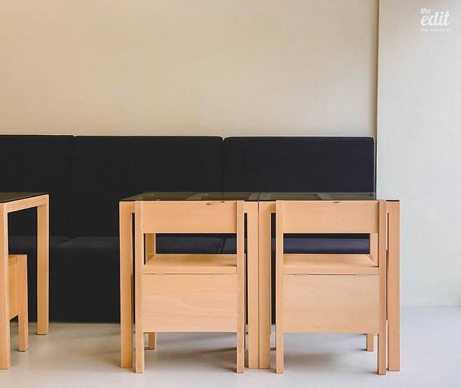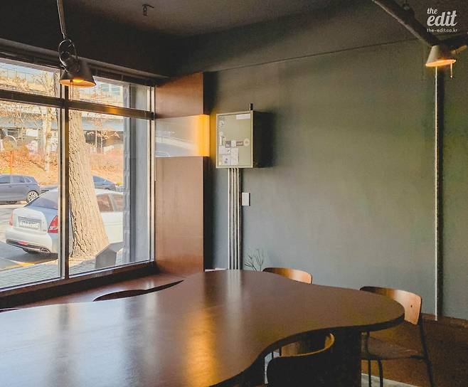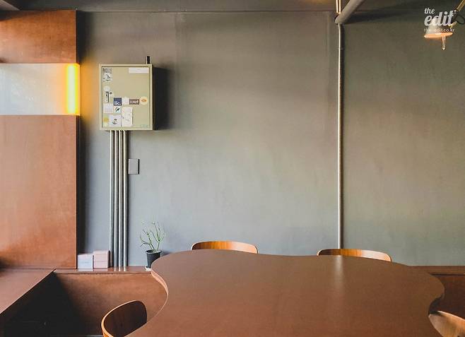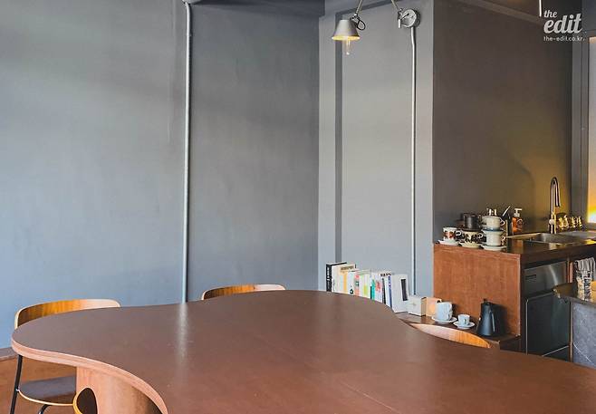 한껏 톤을 낮춘 그레이와 브라운 컬러 중심의 차분한 공간이다. 조도가 낮고 내부 면적도 작지만 건물로 가로막히지 않은 바깥 풍경 덕분인지 답답한 느낌은 들지 않는다. 가운데를 차지한 테이블은 원형도 사각형도 아닌 독특한 형태의 곡선형. 굴곡에 따라 좌석 간의 느슨한 분리가 가능하면서도, 결과적으로는 하나의 테이블을 공유하기 때문에 별도의 테이블을 배치한 것에 비해 단란하고 아늑한 모양새다. 혼자 오더라도 자리 눈치 볼 필요 없는 구조라서 더 좋다.