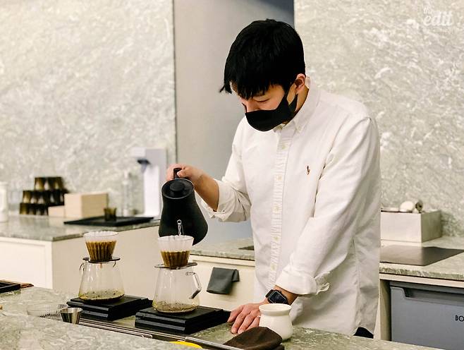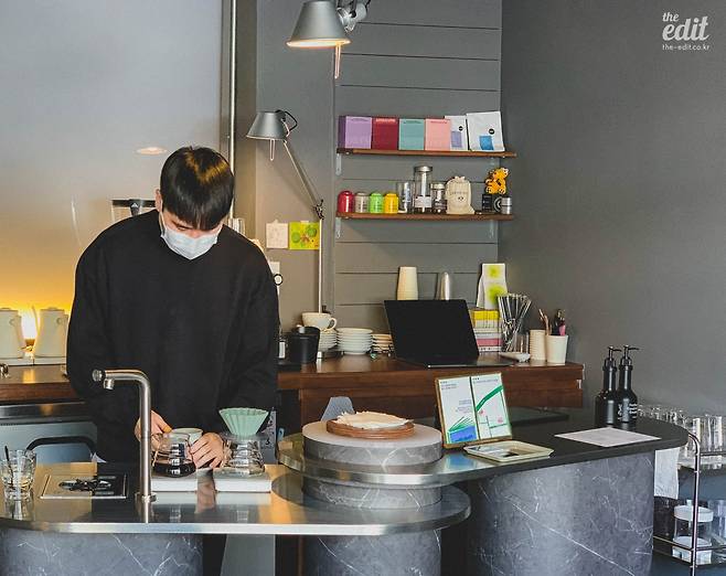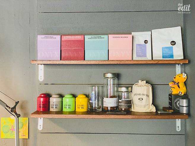 “어느 정도까지 신맛을 즐기는 편이에요?” 첫 대답에 따라 섬세하게 원두 종류를 안내한다. 너무 화려하거나 튀는 스타일을 가진 커피보다는 있는 그대로의 깨끗함이 느껴지는 커피를 중심으로 소개하는데, 모모스커피나 센터 커피 같은 국내 로스터리부터 더 반, 라카브라, 솔벅&한센 등의 해외 유명 로스터리까지 그때그때 나누고 싶은 커피를 엄선한다.