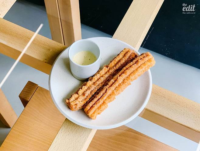 이날 내가 마신 건 뉴욕 브루클린의 ‘SEY COFFEE’에서 로스팅한 콜롬비아 호세 하비에르 카나쿠. 극강의 클린컵을 강조하는 로스터리답게 깨끗한 산미와 은은하게 퍼지는 과일 향이 좋았다. 맛보다도 커피를 내어주며 건네는 말이 더 인상적이다. “처음에는 3분의 1만 따라서 향을 맡은 뒤 맛을 보고, 다음 3분의 1은 천천히 식혀가며 맛의 변화를 느끼고, 마지막 3분의 1은 얼음 컵에 부어 차갑게도 드셔보세요.” 이 한 잔을 풍부하게 느끼길 바라는 마음이 담긴 섬세한 가이드다. 잊지 말고 리코타 츄러스도 꼭 먹어보자. 반죽에 리코타 치즈와 시나몬 스틱 티를 넣어 부드럽고 고소하다. 많이 달지 않아 맘 같아서는 다섯 개는 더 먹고 싶었다.