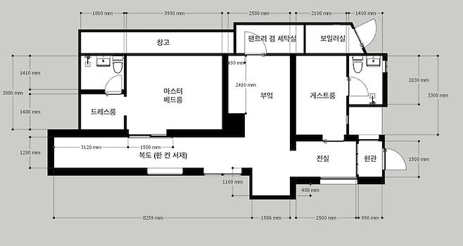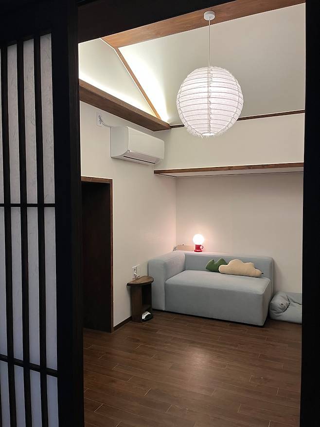 저희 집은 방 4개, 주방 겸 거실, 복도 공간, 보일러실 겸 화장실, 그리고 창고로 이루어져 있었어요. 인테리어 업체와 논의 후 측면에 나있던 현관을 정면으로 끌어오기 위해 앞마당과 가장 가까운 방 일부를 할애해 현관 및 현관 전실을 새로 냈고, 대신 미닫이문으로 연결되어 있던 옆방과 합쳐 하나의 작은 게스트룸을 만들었습니다.