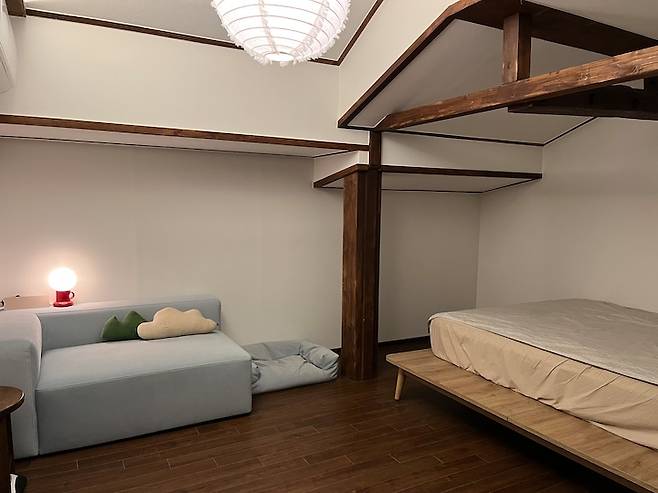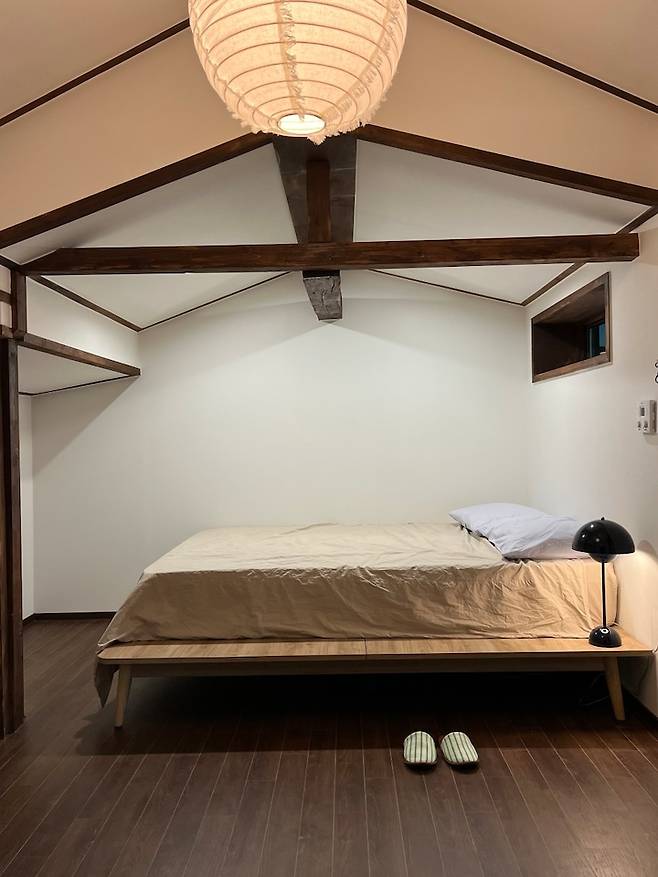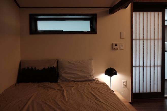침대가 들어갈 공간이 특히 층고가 낮고 또 곳곳에 노출된 구조물이 많기 때문에 헤드가 없는 평상형으로 개방감을 주고 싶었구요.