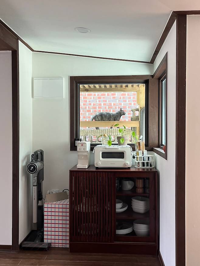 픽스창은 오로지 채광에만 초점을 맞춰 진행된 공사였는데, 뜻밖의 장점으로는 창문 밖 담벼락으로 지나다니는 고양이들을 이따끔씩 만날 수 있다는 거에요. 오늘은 또 언제 지나갈까, 생각하며 식탁에 앉아 커피를 마시는 여유라니. 서울에 살 적에는 생각지도 못했던 순간이에요.