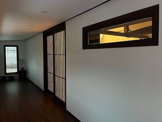 중문에는 간살 디자인을 넣어 집안의 전체적인 무드와 어우러지도록 했어요. 별도 제작으로, 뒤이어 소개할 안방의 미닫이문과 함께 추가 비용을 들여 만들었습니다.