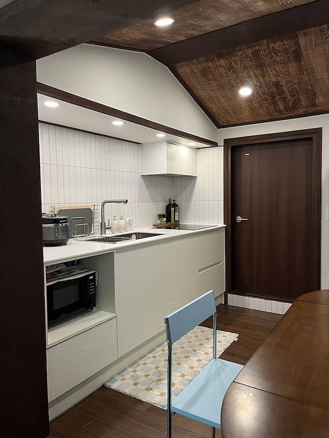 그리 넓지 않은 공간이기에 주방 타일 및 싱크대는 올화이트로 깔끔하게 통일했고, 대신 싱크대에 들어가는 가전은 블랙으로 선택해 너무 밋밋해 보이지 않도록 했어요.
