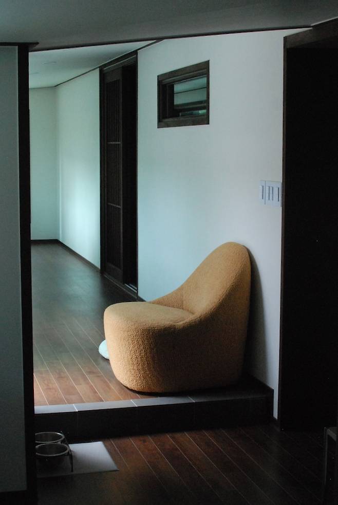 복도 한 켠에는 내부에서도 뒷마당으로 출입할 수 있게 미닫이 샤시를 냈어요. 샤시 바로 앞에 일룸 스톤 1인 소파를 두었더니 또 하나의 오브제 겸 둘도 없는 힐링 스팟이 되었답니다. 살갗에 닿는 햇볕의 감촉을 느끼는 맛도 있구요.