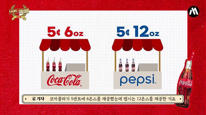 코카콜라에도 흑역사는 있습니다. 코카콜라보다 12년 늦게 출발한 만년 2인자 펩시 때문에 곤욕을 치른 건데요. 코카콜라가 수십 년간 사랑받은 이유 중 하나가 5센트라는 가격을 50년 넘게 유지했기 때문인데, 펩시는 1934년 아예 반값 콜라를 내놓습니다. 코카콜라가 5센트에 6온스를 제공하는데, 펩시는 같은 가격에 12온스를 제공한 거죠. 이를 계기로 펩시는 업계 2위 자리를 공고히 하게 됩니다. 다만 코카콜라의 아성을 무너뜨릴 수는 없었죠.