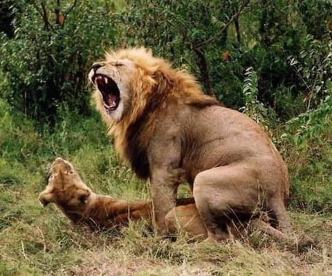 수컷 사자는 마치 자신의 존재감을 드러내려고 하는 듯 암컷 사자와의 짝짓기를 하고 있었습니다.